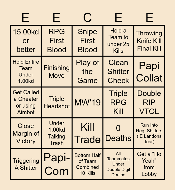 This bingo card has a free space and 24 words: Under 1.00kd Talking Trash, Papi-Corn, Play of the Game, Triggering A Shitter, Throwing Knife Kill Final Kill, 15.00kd or better, Hold Entire Team Under 1.00kd, RPG First Blood, Triple RPG Kill, Kill Trade, Clean Shitter Check, Get Called a Cheater or using Aimbot, 0 Deaths, Run Into Reg. Shitters (IE Landons Tear), Finishing Move, All Teammates Under Double Digit Deaths, Double RIP VTOL, Snipe First Blood, Papi Collat, Triple Headshot, Get a "Ho Yeah" from Lobby, Close Margin of Victory, Hold a Team to under 25 Kills and Bottom Half of Team Combined 10 Kills.