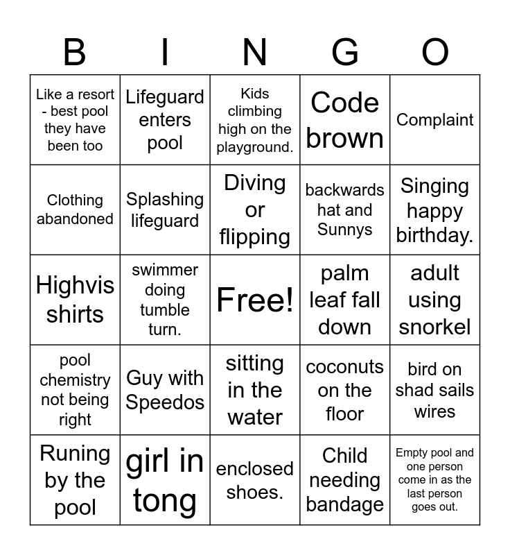 This bingo card has a free space and 24 words: Guy with Speedos, girl in tong, Diving or flipping, Runing by the pool, Complaint, Like a resort - best pool they have been too, Clothing abandoned, Lifeguard enters pool, palm leaf fall down, sitting in the water, backwards hat and Sunnys, Highvis shirts, coconuts on the floor, bird on shad sails wires, Splashing lifeguard, Child needing bandage, adult using snorkel, Kids climbing high on the playground., Singing happy birthday., swimmer doing tumble turn., Empty pool and one person come in as the last person goes out., pool chemistry not being right, Code brown and enclosed shoes..