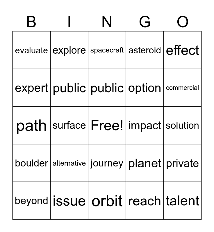 This bingo card has a free space and 24 words: alternative, issue, public, beyond, effect, evaluate, expert, explore, impact, journey, option, path, planet, private, public, reach, solution, spacecraft, commercial, surface, talent, boulder, asteroid and orbit.