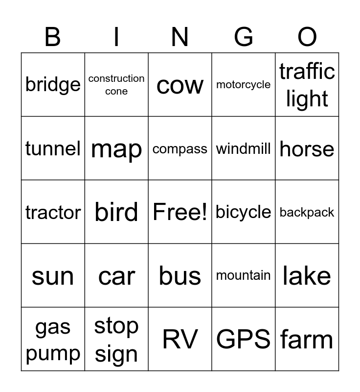 This bingo card has a free space and 24 words: car, stop sign, compass, gas pump, traffic light, bridge, tunnel, construction cone, bicycle, bus, windmill, tractor, mountain, lake, map, GPS, backpack, cow, horse, bird, farm, sun, motorcycle and RV.