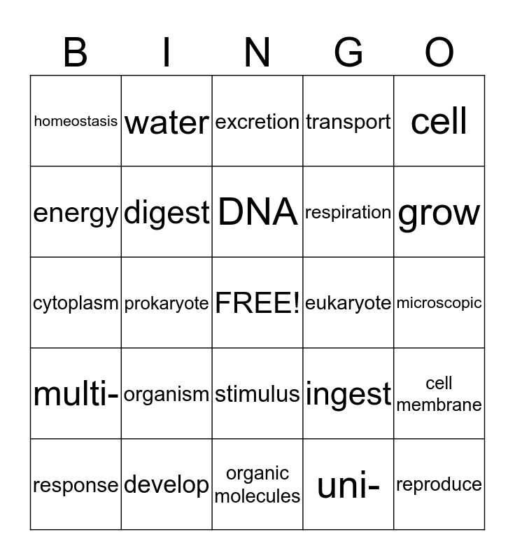 This bingo card has a free space and 24 words: organism, develop, DNA, response, cell, homeostasis, energy, water, eukaryote, stimulus, respiration, cytoplasm, ingest, cell membrane, digest, uni-, microscopic, excretion, grow, prokaryote, reproduce, multi-, transport and organic molecules.
