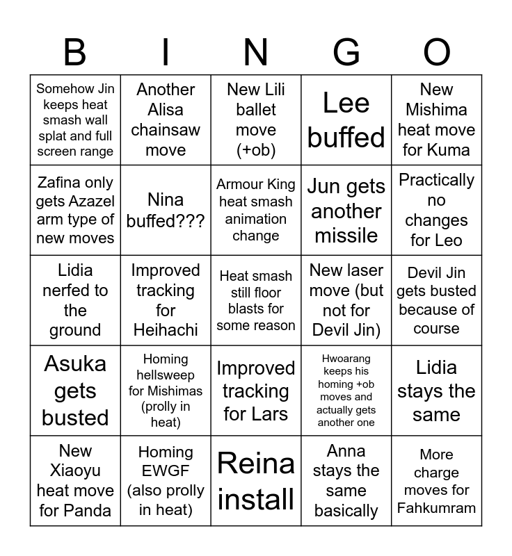 This bingo card has a free space and 24 words: Homing hellsweep for Mishimas (prolly in heat), Homing EWGF (also prolly in heat), Armour King heat smash animation change, New Xiaoyu heat move for Panda, New Mishima heat move for Kuma, Somehow Jin keeps heat smash wall splat and full screen range, Zafina only gets Azazel arm type of new moves, Another Alisa chainsaw move, New laser move (but not for Devil Jin), Improved tracking for Lars, Jun gets another missile, Lidia nerfed to the ground, Hwoarang keeps his homing +ob moves and actually gets another one, Lidia stays the same, Nina buffed???, Anna stays the same basically, Devil Jin gets busted because of course, New Lili ballet move (+ob), Practically no changes for Leo, Improved tracking for Heihachi, More charge moves for Fahkumram, Asuka gets busted, Lee buffed and Reina install.