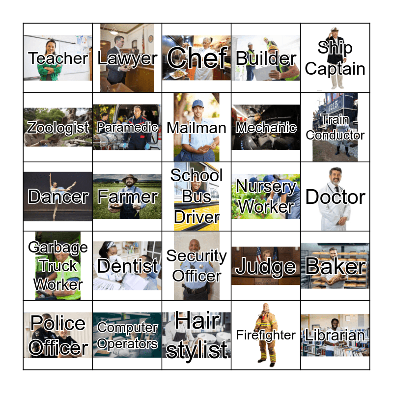 This bingo card has 27 images, a free space and 27 words: Judge, Principal, Mechanic, Hair stylist, Zoologist, Chef, Lawyer, Garbage Truck Worker, Nursery Worker, Baker, Dancer, Builder, Police Officer, Computer Operators, Train Conductor, Pilot, Paramedic, Mailman, Dentist, Teacher, Doctor, Firefighter, Farmer, Librarian, Security Officer, Ship Captain and Crossing Guard.