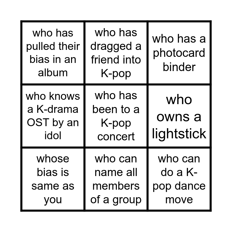 This bingo card has a free space and 8 words: who owns a lightstick, who has a photocard binder, who has dragged a friend into K-pop, whose bias is same as you, who has pulled their bias in an album, who can do a K-pop dance move, who knows a K-drama OST by an idol and who can name all members of a group.