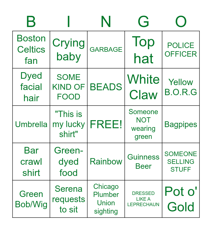This bingo card has a free space and 24 words: Green Bob/Wig, Green-dyed food, BEADS, DRESSED LIKE A LEPRECHAUN, POLICE OFFICER, Boston Celtics fan, Crying baby, GARBAGE, Someone NOT wearing green, Bagpipes, Umbrella, SOME KIND OF FOOD, Guinness Beer, SOMEONE SELLING STUFF, Dyed facial hair, Serena requests to sit, Chicago Plumber Union sighting, Top hat, Yellow B.O.R.G, Bar crawl shirt, "This is my lucky shirt", Rainbow, White Claw and Pot o' Gold.