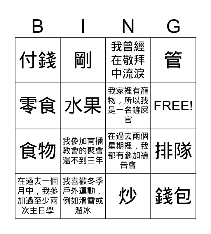 This bingo card has 67 words: 建康, 陪, 部門, 青菜, 身體, 小白菜, 剛, 上市, FREE!, 肉部, 排骨, 紅燒, 炒, 零食, 麵包, 水果, 排隊, 付錢, 推車, 食物, 自言自語, 錢包, 管, 管家, 牛肉, 在過去五天中,我每天都有讀經並打卡, 我最喜歡禱告的地方是在自己的車裡, 我最喜歡的解壓方式是大聲唱敬拜詩歌, 我參加南播教會的聚會還不到三年, 彈奏樂器會讓我感到快樂, 在過去一個月中,我參加過至少兩次主日學, 我能夠背誦詩篇二十三篇, 在過去兩年中,我讀完整本聖經至少一次, 我的週末太忙,通常需要五天才能恢復元氣, 我是一個早起的人, 我更喜歡在家工作, 在過去三年內,我參加過教會的短宣隊,或計劃今年參加, 我參加過兩次關懷同工培訓, 在過去兩個星期裡,我都有參加禱告會, 我已經完成 Plan to Protect 的同工認證, 我每天靈修時使用的是實體聖經,而不是手機, 我家裡有寵物,所以我是一名鏟屎官, 我喜歡冬季戶外運動,例如滑雪或溜冰, 我每天至少喝兩杯咖啡, 我的父母仍然住在國內, 我最初來加拿大是為了求學, 在過去六個月中,我參加過籃球訓練, 在過去一年裡,我曾現場觀看過冰球比賽, 在過去一個月,我邀請過一位新朋友來教會, 我在25歲之前就已經信主, 我曾經在敬拜中流淚, 我喜歡學新的敬拜詩歌, 我喜歡一邊開車一邊聽敬拜音樂, 我在敬拜前或上台時會感到緊張, 我曾經因為聖靈的感動而選歌, 我曾經在服事前忘記帶東西, 我曾經有過「今天敬拜特別被神帶領」的經歷, 我有自己的敬拜歌單, 我會對敬拜時出現的錯誤耿耿於懷, 我平常聽敬拜音樂多過其他類型的音樂, 我比較喜歡輕快的詩歌勝過抒情慢板的詩歌, 我很期待輪到我們這一隊帶領敬拜, 敬拜是我最容易感受到神同在的時候, 當我擔任主領時,會花很多時間選歌, 我最近有一首一直在聽的詩歌, 我有一首第一次聽就很喜歡的詩歌 and 有一首詩歌曾在我低潮時陪伴過我.