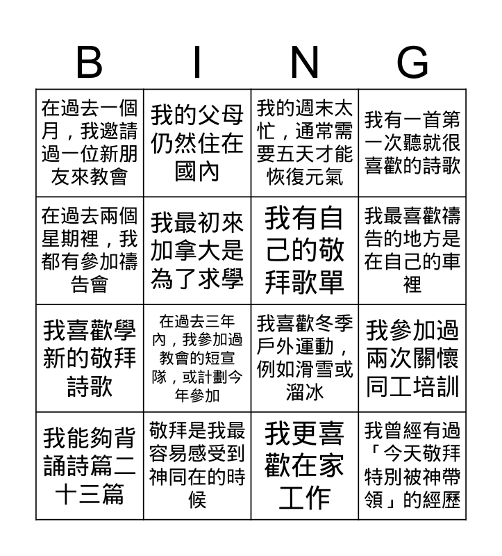 This bingo card has 42 words: 在過去五天中,我每天都有讀經並打卡, 我最喜歡禱告的地方是在自己的車裡, 我最喜歡的解壓方式是大聲唱敬拜詩歌, 我參加南播教會的聚會還不到三年, 彈奏樂器會讓我感到快樂, 在過去一個月中,我參加過至少兩次主日學, 我能夠背誦詩篇二十三篇, 在過去兩年中,我讀完整本聖經至少一次, 我的週末太忙,通常需要五天才能恢復元氣, 我是一個早起的人, 我更喜歡在家工作, 在過去三年內,我參加過教會的短宣隊,或計劃今年參加, 我參加過兩次關懷同工培訓, 在過去兩個星期裡,我都有參加禱告會, 我已經完成 Plan to Protect 的同工認證, 我每天靈修時使用的是實體聖經,而不是手機, 我家裡有寵物,所以我是一名鏟屎官, 我喜歡冬季戶外運動,例如滑雪或溜冰, 我每天至少喝兩杯咖啡, 我的父母仍然住在國內, 我最初來加拿大是為了求學, 在過去六個月中,我參加過籃球訓練, 在過去一年裡,我曾現場觀看過冰球比賽, 在過去一個月,我邀請過一位新朋友來教會, 我在25歲之前就已經信主, 我曾經在敬拜中流淚, 我喜歡學新的敬拜詩歌, 我喜歡一邊開車一邊聽敬拜音樂, 我在敬拜前或上台時會感到緊張, 我曾經因為聖靈的感動而選歌, 我曾經在服事前忘記帶東西, 我曾經有過「今天敬拜特別被神帶領」的經歷, 我有自己的敬拜歌單, 我會對敬拜時出現的錯誤耿耿於懷, 我平常聽敬拜音樂多過其他類型的音樂, 我比較喜歡輕快的詩歌勝過抒情慢板的詩歌, 我很期待輪到我們這一隊帶領敬拜, 敬拜是我最容易感受到神同在的時候, 當我擔任主領時,會花很多時間選歌, 我最近有一首一直在聽的詩歌, 我有一首第一次聽就很喜歡的詩歌 and 有一首詩歌曾在我低潮時陪伴過我.