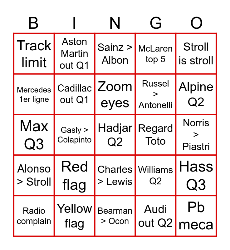 This bingo card has a free space and 24 words: Red flag, Yellow flag, Zoom eyes, Radio complain, Stroll is stroll, Track limit, Mercedes 1er ligne, Aston Martin out Q1, Regard Toto, Charles > Lewis, Russel > Antonelli, Max Q3, Williams Q2, Hass Q3, Cadillac out Q1, Audi out Q2, Norris > Piastri, Sainz > Albon, Alpine Q2, Gasly > Colapinto, Pb meca, Alonso > Stroll, McLaren top 5 and Bearman > Ocon.