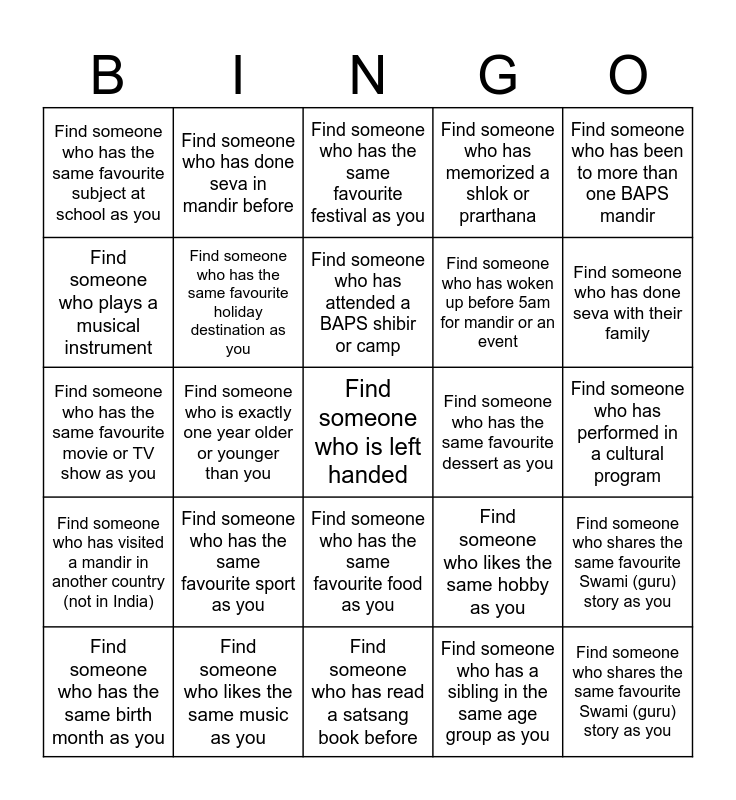 This bingo card has 26 words: Find someone who has the same favourite food as you, Find someone who has a sibling in the same age group as you, Find someone who has attended a BAPS shibir or camp, Find someone who likes the same music as you, Find someone who has been to more than one BAPS mandir, Find someone who has the same favourite subject at school as you, Find someone who plays a musical instrument, Find someone who has done seva in mandir before, Find someone who has performed in a cultural program, Find someone who likes the same hobby as you, Find someone who has woken up before 5am for mandir or an event, Find someone who has the same favourite movie or TV show as you, Find someone who shares the same favourite Swami (guru) story as you, Find someone who has the same birth month as you, Find someone who is exactly one year older or younger than you, Find someone who has the same favourite kirtan as you, Find someone who has memorized a shlok or prarthana, Find someone who has visited a mandir in another country (not in India), Find someone who has the same favourite festival as you, Find someone who is left handed, Find someone who has done seva with their family, Find someone who has read a satsang book before, Find someone who has the same favourite dessert as you, Find someone who has the same favourite sport as you, Find someone who has the same favourite holiday destination as you and Find someone who shares the same favourite Swami (guru) story as you.