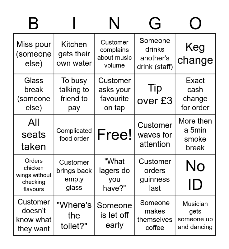 This bingo card has a free space and 24 words: Customer brings back empty glass, "Where's the toilet?", Customer asks your favourite on tap, Customer doesn't know what they want, Keg change, Miss pour (someone else), Glass break (someone else), Kitchen gets their own water, Customer waves for attention, "What lagers do you have?", Tip over £3, All seats taken, Customer orders guinness last, No ID, To busy talking to friend to pay, Someone makes themselves coffee, More then a 5min smoke break, Customer complains about music volume, Exact cash change for order, Complicated food order, Musician gets someone up and dancing, Orders chicken wings without checking flavours, Someone drinks another's drink (staff) and Someone is let off early.