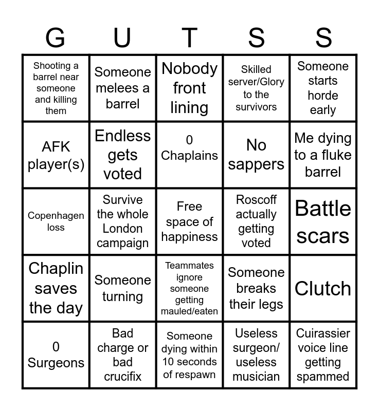 This bingo card has a free space and 24 words: Someone turning, Bad charge or bad crucifix, 0 Chaplains, 0 Surgeons, Someone starts horde early, Shooting a barrel near someone and killing them, AFK player(s), Someone melees a barrel, Roscoff actually getting voted, Teammates ignore someone getting mauled/eaten, No sappers, Copenhagen loss, Someone breaks their legs, Clutch, Endless gets voted, Useless surgeon/ useless musician, Battle scars, Nobody front lining, Me dying to a fluke barrel, Survive the whole London campaign, Cuirassier voice line getting spammed, Chaplin saves the day, Skilled server/Glory to the survivors and Someone dying within 10 seconds of respawn.