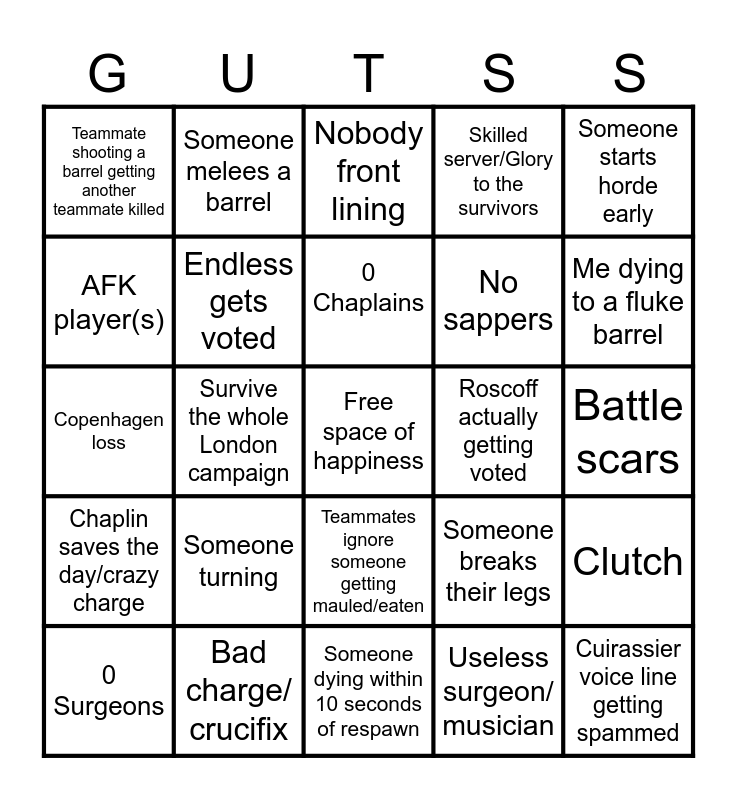 This bingo card has a free space and 24 words: Someone turning, Bad charge/ crucifix, 0 Chaplains, 0 Surgeons, Someone starts horde early, Teammate shooting a barrel getting another teammate killed, AFK player(s), Someone melees a barrel, Roscoff actually getting voted, Teammates ignore someone getting mauled/eaten, No sappers, Copenhagen loss, Someone breaks their legs, Clutch, Endless gets voted, Useless surgeon/ musician, Battle scars, Nobody front lining, Me dying to a fluke barrel, Survive the whole London campaign, Cuirassier voice line getting spammed, Chaplin saves the day/crazy charge, Skilled server/Glory to the survivors and Someone dying within 10 seconds of respawn.