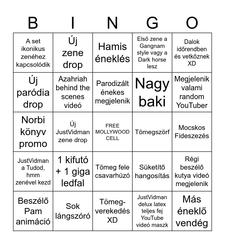 This bingo card has a free space and 24 words: 1 kifutó + 1 giga ledfal, Sok lángszóró, Parodizált énekes megjelenik, Beszélő Pam animáció, Dalok időrendben és vetkőznek XD, A set ikonikus zenéhez kapcsolódik, Új paródia drop, Új zene drop, Tömegszörf, Tömeg fele csavarhúzó, Nagy baki, Norbi könyv promo, Süketítő hangosítás, Régi beszélő kutya videó megjelenik, Azahriah behind the scenes videó, JustVidman delux latex teljes fej YouTube videó maszk, Mocskos Fideszezés, Hamis éneklés, Megjelenik valami random YouTuber, Új JustVidman zene drop, Más éneklő vendég, JustVidman a Tudod, hmm zenével kezd, Első zene a Gangnam style vagy a Dark horse lesz and Tömeg-verekedés XD.