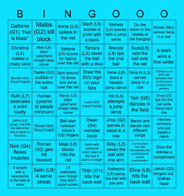 This bingo card has 109 words: Player saves a ball outside the court, The ball hits the antenna, A team wins a five setter, A team loses a five setter, People argue too long with the ref, Opponents complain about the drums, Beercup gets knocked over, Sweat towels being used on the floor, Player gets injured, Bench and stands start different songs, Anissa (L1) dives into the other court during rally, Merel (L1) hits over the block, Lisette (L1) dive-sets the ball, Hartenvrouw chant (L1), Gwyneth (L2) tips the 2nd ball twice in a row, Silay (L2) saves the ball with one arm, Tamara (L2) saves the ball with a dive, Nadine (L2) scores a point with a block, Emma (L3) does an underhand serve, Heleen (L3) Killer block, Nina N.(L3) serves twice in a row, Ruth (L3) dive-sets the ball, Julia (L3) dives but misses the ball, Roos (L4) ace serve, L4 celebrates even though they didn't score a point, Christine (L4) makes a crazy save, Michela (L4) scores with a jump serve, Iris (L4) attempts a jump serve, Kirsten (L4) attacks a “3”, Maria (L5) dives but doesn’t touch the ball, Stefanie (L5) scores by tipping over the net, Marit (L5) scores a point with a block, Anne (L5) spikes in the net, Isa (L6) scores a point with a block, Maja (L6) blocks into the net, Suze(L6) sets the ball over the net, Samyu (L6) hits the ball into the stands, Aafke (L6) touches the net, Ruth (L7) celebrates a point loudly, Yara (L7) accidently touches the net, Maria (L7) chases a ball off the court, Flora (L7) keeps rally alive with a dive, Mies (L8) plays upperhand straight deep corner, Brenda (L8) tips the 2nd ball, Irene (L8) does a topspin jump serve, Eline (L8) hits the back wall, Jaimy (L8) jumps, but hits the ball when she is back on the floor, Selin (L8) 4 serve streak, Setter and middle collide like it’s rush hour (L9), Anna (L9) tips the 2nd ball while being back row, Silke (L9) serves a sky ball underhand, Katherina (L9) saves the ball with one arm, Mandy (L9) plays upperhand straight deep corner, Vivian (L9) keeps the rally alive with a foot, Tyler (Mix) ball hits the ceiling, Tullia (Mix) jumps into the net, Mandana (Mix) “sorry sorry sorry”, Tyler (Mix) dives but misses the ball, Thea (Mix) serves the ball uperhand in the net, Amber (Mix) serves twice in a row, Dathimo (G1) “Het is klaar”, Balthasar (G1) shanks a pass, Lucas (G1) attacks in the 3m, Romein (G1) plays more than 1 set, Timon (G1) ace serve, Thijn (G1) hits the back wall, Ben (G2) hits the back wall, Ball slips between Johan’s (G2) fingers, Jirka (G2) serves in twice in a row, Roman (G2) gets kill blocked, Jakub (G2) tongue out, shakes head, Mattis (G2) kill block, Taeke (G3) audible in the entire hall, Maarten (G3) swings the overpass into the net, Jasper (G3) kill block, Riqu (G3) block touch, Borrian (G3) THUUTHERS, Lukas (G3) tips a 10-attack, Owen (G4) monster block, Rafael (G4) does a flip, Nick (G4) flexes muscles, Olivier (G4) THUUTHER, Felix (G5) sets way past the antenna, 6 people with a moustache in the field at once, Luuk (G5) THUUTHERS, Mik (G5) monster block, Yaïr (G5) dances in the field, Get a team selfie with 6 players from different teams, Do the worm in the middle of the hangout, Broek uit op je hoofd, Start a wave in the crowd, Spin around 10 times and serve over the net, Teach someone a handshake you invent together., Commentate one rally dramatically like a professional sports commentator., Recreate the dramatic Nishida sliding apology., Whole team chugs a beer, Do a TikTok trend with your team (dance), Take a photo with someone from every team (doesn’t have to be all in 1 photo), Human pyramid (6 people minimum), Selfie with someone who’s been at the club 5 years or longer, Find an original object that represents your team, Write a rap song for the ACCO, Change your shirt with someone from another team (at least one person), Draw the SVU logo on your face, Make a dance for the ACCO on the song krokobil, Do a cartwheel while you're in the field, Give the referee a compliment, Interview someone who just played a match and Teach an opponent a SVU chant.