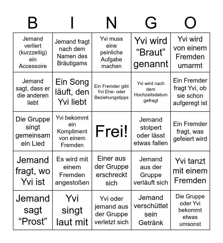 This bingo card has a free space and 29 words: Jemand sagt “Prost”, Ein Fremder wünscht Glück für die Hochzeit, Yvi bekommt ein Kompliment von einem Fremden, Fremde machen ein Foto mit der Gruppe oder Yvi, Jemand verliert (kurzzeitig) ein Accessoire, Yvi muss eine peinliche Aufgabe machen, Ein Song läuft, den Yvi liebt, Es wird mit einem Fremden angestoßen, Jemand stolpert oder lässt etwas fallen, Yvi singt laut mit, Ein Fremder fragt, was gefeiert wird, Die Gruppe oder Yvi bekommt etwas umsonst, Yvi oder jemand aus der Gruppe verletzt sich, Jemand verschüttet sein Getränk, Ein Fremder fragt Yvi, ob sie schon aufgeregt ist, Yvi bekommt einen Lachanfall, Einer aus der Gruppe erschreckt sich, Jemand fragt, wo Yvi ist, Yvi wird von einem Fremden umarmt, Die Gruppe singt gemeinsam ein Lied, Jemand aus der Gruppe verläuft sich, Yvi nimmt ein Video auf, Yvi wird nach dem Hochzeitsdatum gefragt, Jemand sagt, dass er die anderen liebt, Yvi wird “Braut” genannt, Jemand fragt nach dem Namen des Bräutigams, Yvi tanzt mit einem Fremden, Ein Fremder gibt Yvi Ehe- oder Beziehungstipps and Yvi macht einen Snap.