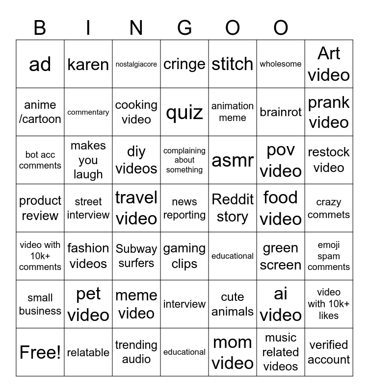 This bingo card has 49 words: ai video, brainrot, mom video, street interview, diy videos, crazy commets, karen, trending audio, wholesome, gaming clips, Art video, cringe, pov video, asmr, pet video, food video, anime /cartoon, prank video, video with 10k+ likes, stitch, animation meme, travel video, ad, commentary, Free!, cooking video, restock video, relatable, complaining about something, makes you laugh, verified account, Reddit story, small business, meme video, product review, educational, green screen, emoji spam comments, bot acc comments, Subway surfers, interview, video with 10k+ comments, news reporting, educational, quiz, nostalgiacore, cute animals, fashion videos and music related videos.
