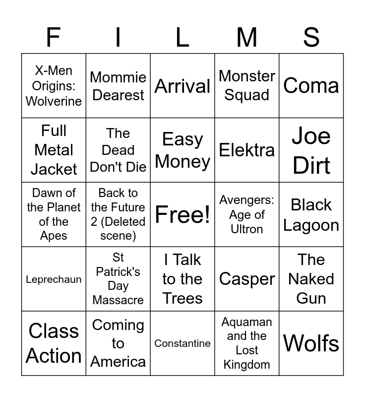 This bingo card has a free space and 69 words: Shadow in the Cloud, Black Lagoon, Body of Evidence, Captain America: Brave New World, Coming to America, Boondock Saints: All Saints Day, Monster Squad, PotC: Curse of the Black Pearl, Coma, Fly me to the Moon, The Naked Gun, Hot Shots, X-Men Origins: Wolverine, Arrival, Blind Date, Back to the Future 2 (Deleted scene), I Talk to the Trees, Elektra, Mr. & Mrs. Smith, Leprechaun, Avengers: Age of Ultron, Casper, Joe Dirt, Red Dragon, Searching for Bobby Fischer, Raging Bull, A Real Pain, Leprechaun: Back 2 Tha Hood, Aquaman and the Lost Kingdom, Fury, Mommie Dearest, No Country for Old Men, Robin Hood, The Day After Tomorrow, American Pie, Boondock Saints, Misery, Transformers: Age of Extinction, Full Metal Jacket, We Were Soldiers, St Patrick's Day Massacre, Wolfs, The Dark Knight Rises, Sing Street, Nuts, Class Action, Superman II, Throw Momma from the Train, South Park, The Dead Don't Die, Easy Money, Bill & Ted Face the Music, Revenge of the Nerds, Constantine, The Grapes of Wrath, The Other Guys, Cast Away, Hancock, Saving Private Ryan, Dawn of the Planet of the Apes, Spaceballs, Weird Science, Joe Dirt 2: Beautiful Loser, Ghost Whisperer, Mad Max, The Beekeeper, Transformers: The Last Knight, The Dirt and The Nice Guys.