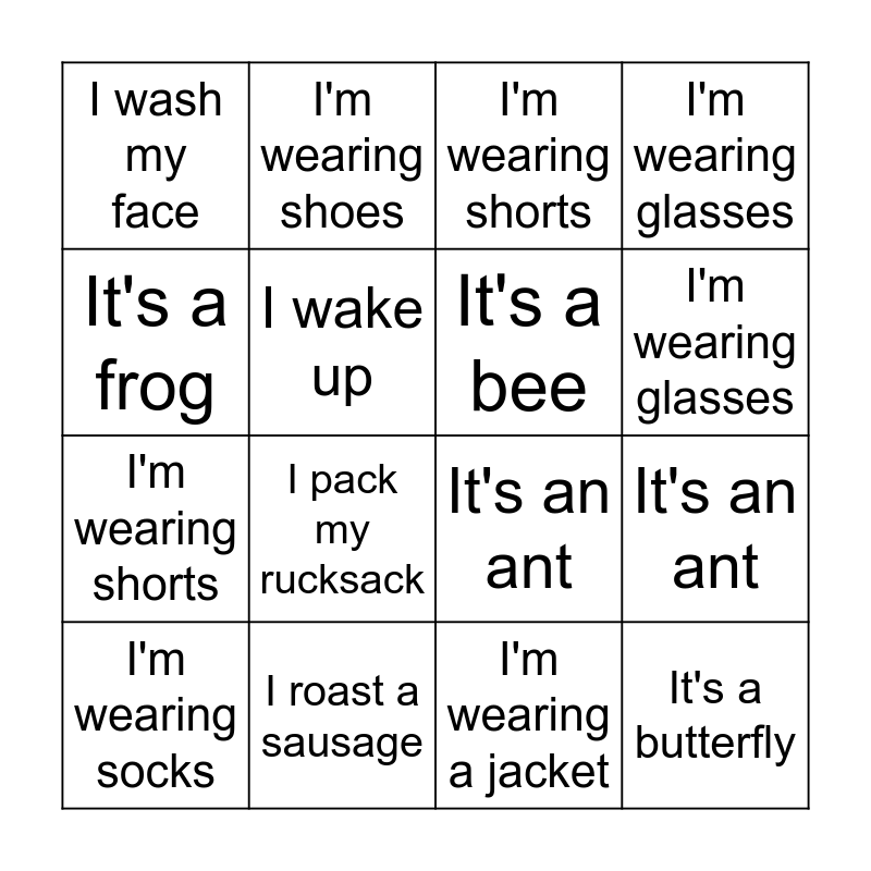 ⚠ This card has duplicate items: It's a worm (2), It's an ant (2), It's a mosquito (2), It's a butterfly (2), It's a bee (2), It's a frog (2), I'm wearing a jacket (2), I'm wearing shoes (2), I'm wearing socks (2), I'm wearing glasses (2), I'm wearing shorts (2), I wake up (2), I wash my face (2), I roast a sausage (2), I fix the tent (2)