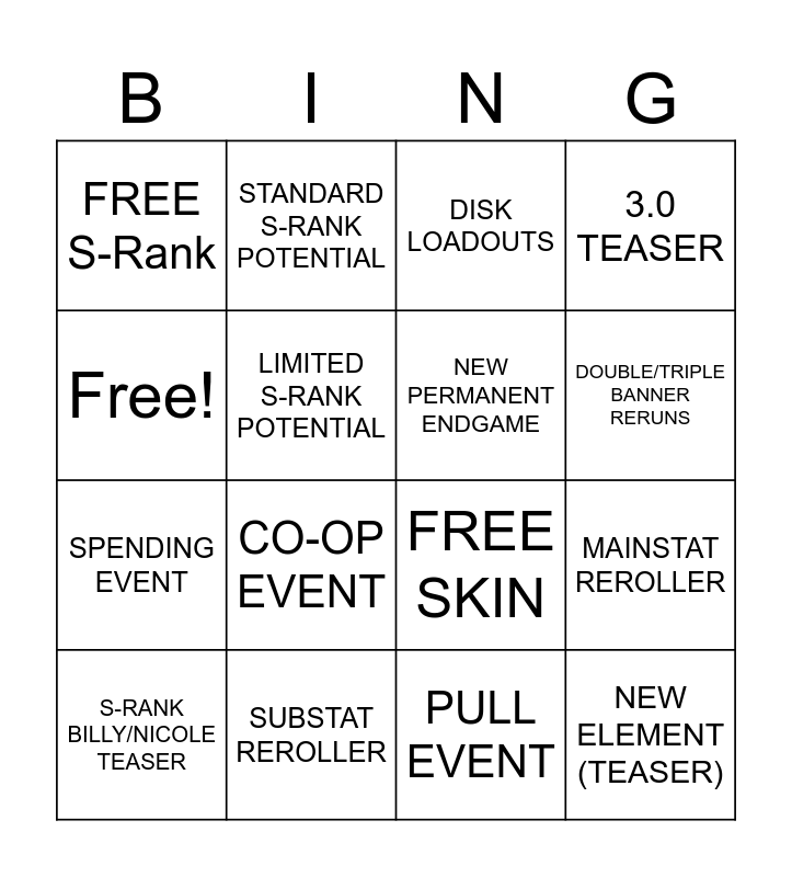 This bingo card has 16 words: SUBSTAT REROLLER, MAINSTAT REROLLER, DISK LOADOUTS, FREE S-Rank, SPENDING EVENT, STANDARD S-RANK POTENTIAL, FREE SKIN, PULL EVENT, Free!, LIMITED S-RANK POTENTIAL, S-RANK BILLY/NICOLE TEASER, 3.0 TEASER, CO-OP EVENT, DOUBLE/TRIPLE BANNER RERUNS, NEW PERMANENT ENDGAME and NEW ELEMENT (TEASER).