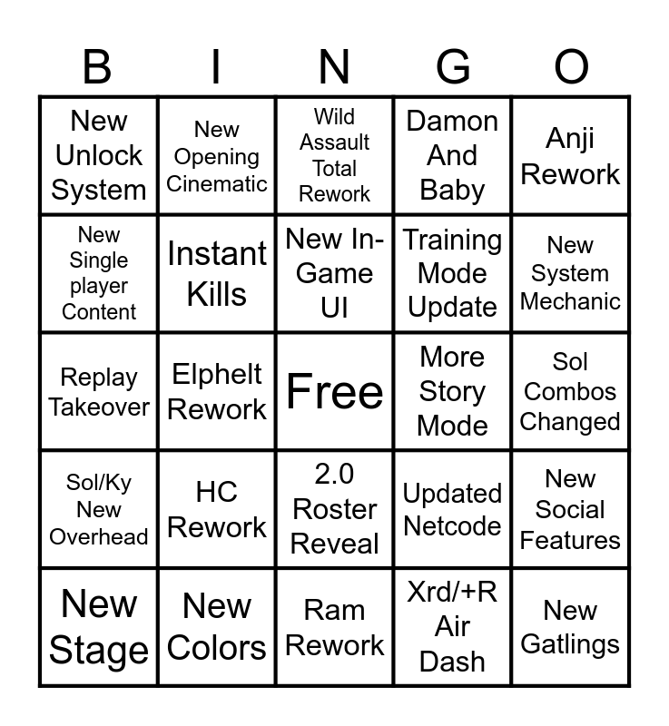 This bingo card has a free space and 24 words: HC Rework, New Colors, New In-Game UI, New Stage, Anji Rework, New Unlock System, New Single player Content, New Opening Cinematic, More Story Mode, 2.0 Roster Reveal, Training Mode Update, Replay Takeover, Updated Netcode, New Social Features, Instant Kills, Xrd/+R Air Dash, Sol Combos Changed, Wild Assault Total Rework, New System Mechanic, Elphelt Rework, New Gatlings, Sol/Ky New Overhead, Damon And Baby and Ram Rework.