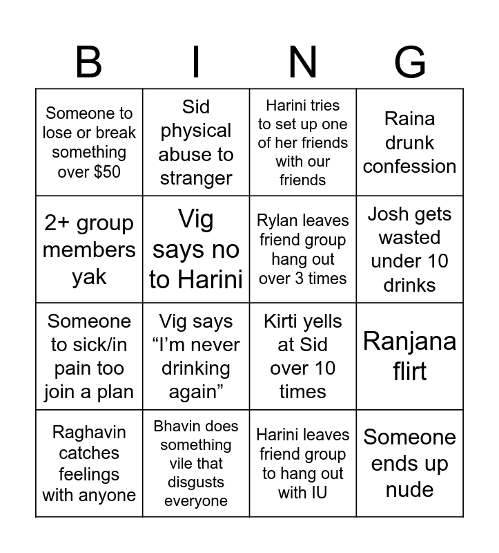 This bingo card has 16 words: Bhavin does something vile that disgusts everyone, Ranjana flirt, Harini tries to set up one of her friends with our friends, Someone to lose or break something over $50, Someone to sick/in pain too join a plan, Sid physical abuse to stranger, Kirti yells at Sid over 10 times, Harini leaves friend group to hang out with IU, 2+ group members yak, Vig says no to Harini, Raghavin catches feelings with anyone, Raina drunk confession, Vig says “I’m never drinking again”, Josh gets wasted under 10 drinks, Rylan leaves friend group hang out over 3 times and Someone ends up nude.