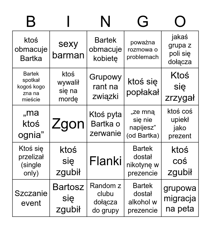 This bingo card has a free space and 24 words: ktoś się zgubił, Bartosz się zgubił, Grupowy rant na związki, Szczanie event, jakaś grupa z poli się dołącza, ktoś obmacuje Bartka, Bartek spotkał kogoś kogo zna na mieście, sexy barman, „ze mną się nie napijesz” (od Bartka), Flanki, ktoś się popłakał, „ma ktoś ognia”, Bartek dostał nikotynę w prezencie, ktoś coś zgubił, ktoś wywalił się na mordę, Bartek dostał alkohol w prezencie, ktoś coś upiekł jako prezent, Bartek obmacuje kobietę, Ktoś się zrzygał, Zgon, grupowa migracja na peta, Ktoś się przelizał (single only), poważna rozmowa o problemach and Random z clubu dołącza do grupy.
