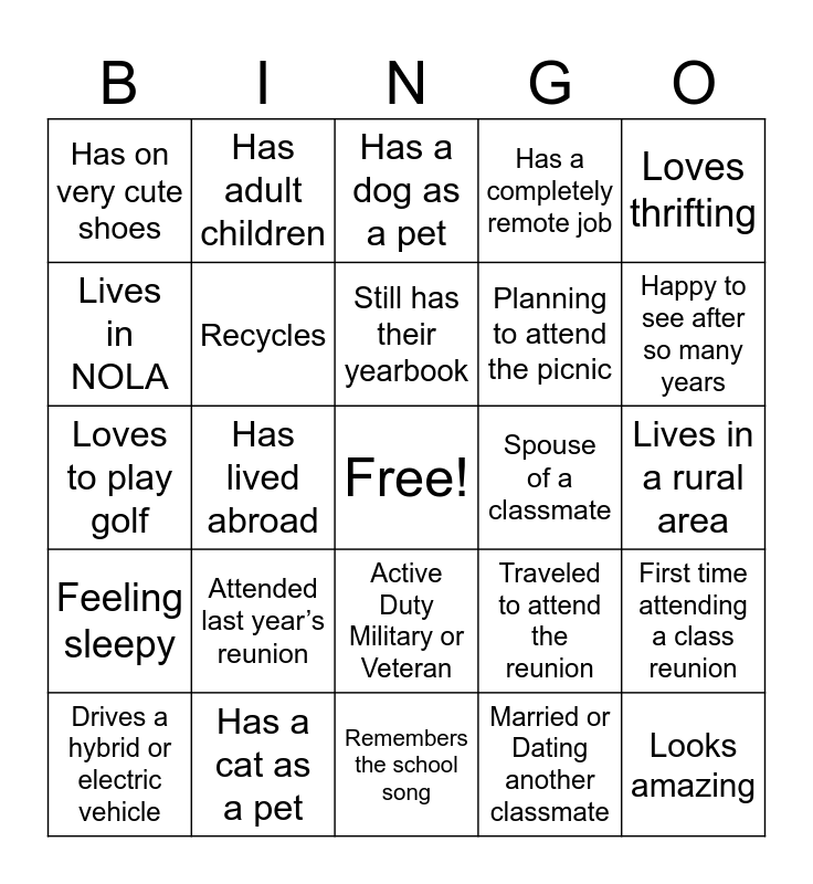This bingo card has a free space and 24 words: Attended last year’s reunion, Has a cat as a pet, Still has their yearbook, Drives a hybrid or electric vehicle, Loves thrifting, Has on very cute shoes, Lives in NOLA, Has adult children, Spouse of a classmate, Active Duty Military or Veteran, Planning to attend the picnic, Loves to play golf, Traveled to attend the reunion, First time attending a class reunion, Recycles, Married or Dating another classmate, Lives in a rural area, Has a dog as a pet, Happy to see after so many years, Has lived abroad, Looks amazing, Feeling sleepy, Has a completely remote job and Remembers the school song.