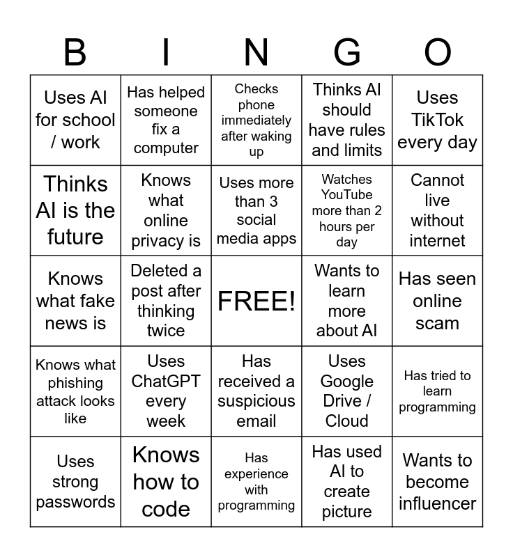 This bingo card has a free space and 24 words: Uses ChatGPT every week, Knows how to code, Uses more than 3 social media apps, Uses strong passwords, Uses TikTok every day, Uses AI for school / work, Thinks AI is the future, Has helped someone fix a computer, Wants to learn more about AI, Has received a suspicious email, Watches YouTube more than 2 hours per day, Knows what fake news is, Uses Google Drive / Cloud, Has tried to learn programming, Knows what online privacy is, Has used AI to create picture, Has seen online scam, Checks phone immediately after waking up, Cannot live without internet, Deleted a post after thinking twice, Wants to become influencer, Knows what phishing attack looks like, Thinks AI should have rules and limits and Has experience with programming.
