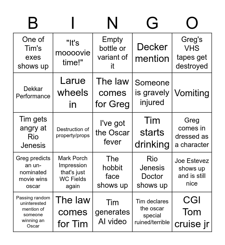 This bingo card has a free space and 24 words: Mark Porch Impression that's just WC Fields again, The law comes for Tim, The law comes for Greg, Passing random uninterested mention of someone winning an Oscar, Greg's VHS tapes get destroyed, One of Tim's exes shows up, Dekkar Performance, "It's moooovie time!", Tim starts drinking, The hobbit face shows up, Someone is gravely injured, Tim gets angry at Rio Jenesis, Rio Jenesis Doctor shows up, Joe Estevez shows up and is still nice, Larue wheels in, Tim declares the oscar special ruined/terrible, Greg comes in dressed as a character, Empty bottle or variant of it, Vomiting, Destruction of property/props, CGI Tom cruise jr, Greg predicts an un-nominated movie wins oscar, Decker mention and Tim generates AI video.