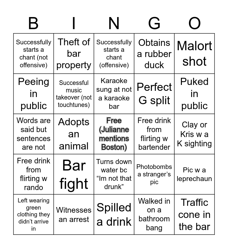 This bingo card has a free space and 24 words: Bar fight, Witnesses an arrest, Karaoke sung at not a karaoke bar, Left wearing green clothing they didn’t arrive in, Malort shot, Successfully starts a chant (not offensive), Peeing in public, Theft of bar property, Free drink from flirting w bartender, Turns down water bc “Im not that drunk”, Perfect G split, Words are said but sentences are not, Photobombs a stranger’s pic, Pic w a leprechaun, Successful music takeover (not touchtunes), Walked in on a bathroom bang, Clay or Kris w a K sighting, Successfully starts a chant (offensive), Puked in public, Adopts an animal, Traffic cone in the bar, Free drink from flirting w rando, Obtains a rubber duck and Spilled a drink.