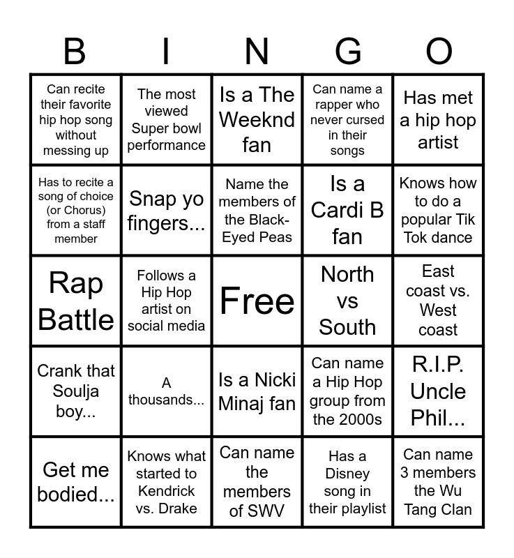 This bingo card has a free space and 29 words: Get me bodied..., Is a NBA YoungBoy fan, Follows a Hip Hop artist on social media, Can name a Hip Hop artist from the 90s, Can recite their favorite hip hop song without messing up, Is a The Weeknd fan, Snap yo fingers..., A thousands..., North vs South, Knows what started to Kendrick vs. Drake, East coast vs. West coast, Can name 3 members the Wu Tang Clan, Can name the members of SWV, Has a Disney song in their playlist, Knows how to do a popular Tik Tok dance, Most random song in your playlist, Is a Nicki Minaj fan, Crank that Soulja boy..., Has met a hip hop artist, Rap Battle, Can name a Hip Hop group from the 2000s, Can recite THE most popular Lady Gaga intro, Is a Cardi B fan, Has to recite a song of choice (or Chorus) from a staff member, Can name a rapper who never cursed in their songs, The most viewed Super bowl performance, R.I.P. Uncle Phil..., Name the members of the Black-Eyed Peas and Who listens to Taylor Swift.