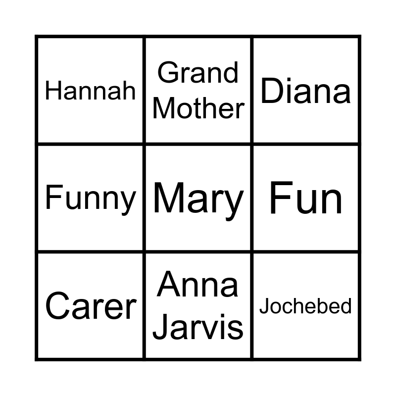 This bingo card has a free space and 23 words: Mother Hen, Church, Anna Jarvis, Caring, Jochebed, Hannah, Fun, Grand Mother, Queen Mother, Giving, Rose Kennedy, Ruth, Children, Enid Blyton, Love, Beautiful, Diana, Comfort, Carer, Mother Teresa, Funny, Marie Currie and Pam Shipman.