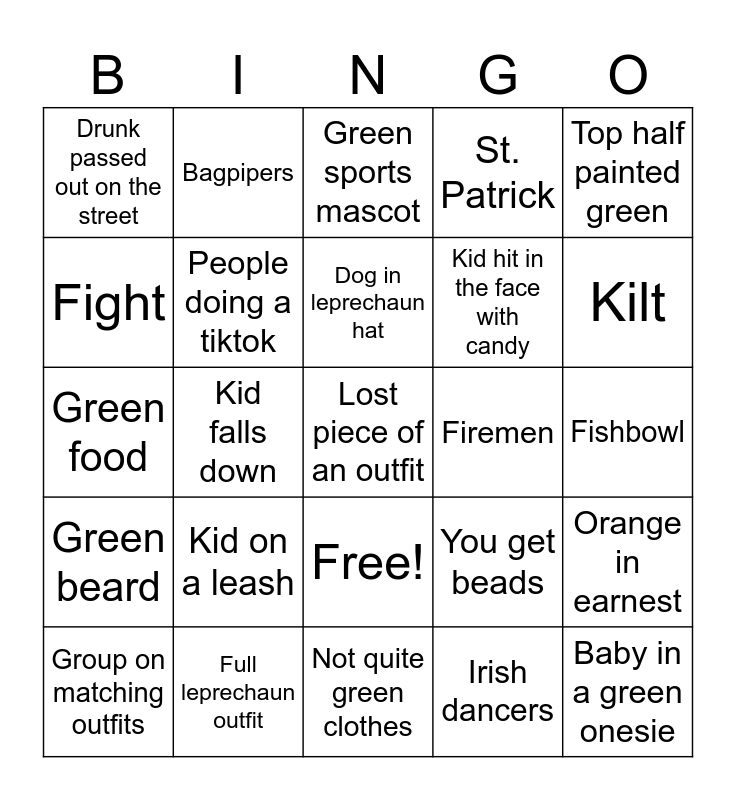 This bingo card has 26 words: Free!, Irish dancers, Dog in leprechaun hat, Full leprechaun outfit, Top half painted green, Drunk passed out on the street, Fight, Bagpipers, Fishbowl, You get beads, Kid hit in the face with candy, Green food, Orange in earnest, Group on matching outfits, Kid falls down, Shriners, St. Patrick, Green beard, Green sports mascot, Lost piece of an outfit, Kilt, Not quite green clothes, Firemen, Kid on a leash, People doing a tiktok and Baby in a green onesie.
