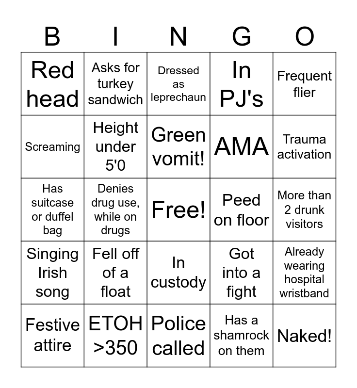 This bingo card has a free space and 24 words: Fell off of a float, ETOH >350, Green vomit!, Festive attire, Frequent flier, Red head, Screaming, Asks for turkey sandwich, Peed on floor, In custody, AMA, Has suitcase or duffel bag, Got into a fight, Already wearing hospital wristband, Height under 5'0, Has a shamrock on them, More than 2 drunk visitors, Dressed as leprechaun, Trauma activation, Denies drug use, while on drugs, Naked!, Singing Irish song, In PJ's and Police called.