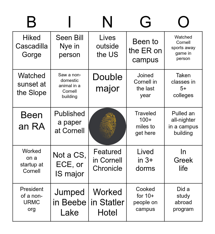 This bingo card has a free space and 24 words: Not a CS, ECE, or IS major, Jumped in Beebe Lake, Double major, President of a non-URMC org, Watched Cornell sports away game in person, Hiked Cascadilla Gorge, Watched sunset at the Slope, Seen Bill Nye in person, Traveled 100+ miles to get here, Featured in Cornell Chronicle, Joined Cornell in the last year, Been an RA, Lived in 3+ dorms, In Greek life, Saw a non-domestic animal in a Cornell building, Cooked for 10+ people on campus, Pulled an all-nighter in a campus building, Lives outside the US, Taken classes in 5+ colleges, Published a paper at Cornell, Did a study abroad program, Worked on a startup at Cornell, Been to the ER on campus and Worked in Statler Hotel.
