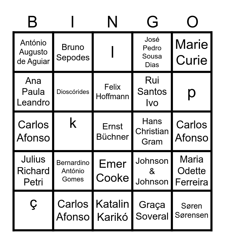 This bingo card has 27 words: Alexander Fleming, Bernardino António Gomes, Ernst Büchner, Graça Soveral, Marie Curie, Ana Paula Leandro, Bruno Sepodes, Emer Cooke, Hans Christian Gram, Maria Odette Ferreira, Julius Richard Petri, Dioscórides, Johnson & Johnson, Søren Sørensen, Carlos Afonso, Carlos Afonso, Felix Hoffmann, José Pedro Sousa Dias, Carlos Afonso, António Augusto de Aguiar, k, Katalin Karikó, Rui Santos Ivo, p, ç, l and m.