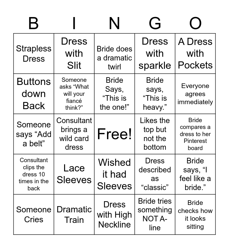 This bingo card has a free space and 24 words: Lace Sleeves, Dramatic Train, Bride Says, “This is the one!”, Someone Cries, A Dress with Pockets, Strapless Dress, Buttons down Back, Dress with Slit, Likes the top but not the bottom, Wished it had Sleeves, Bride says, “This is heavy.”, Someone says “Add a belt”, Dress described as “classic”, Bride says, “I feel like a bride.”, Someone asks “What will your fiancé think?”, Bride tries something NOT A-line, Bride compares a dress to her Pinterest board, Bride does a dramatic twirl, Everyone agrees immediately, Consultant brings a wild card dress, Bride checks how it looks sitting, Consultant clips the dress 10 times in the back, Dress with sparkle and Dress with High Neckline.