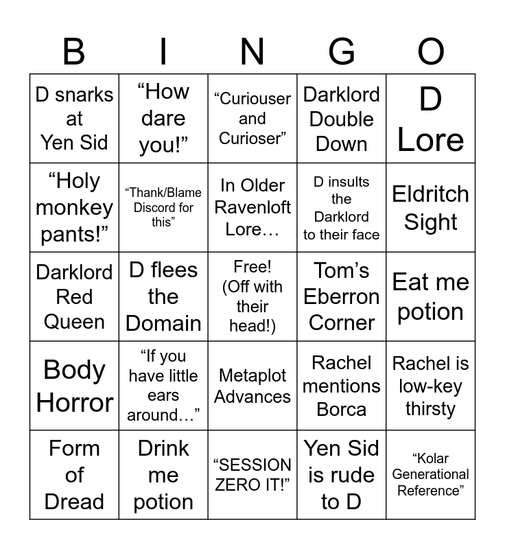 This bingo card has a free space and 47 words: "Guys it’s so bad!”, “Kolar Generational Reference”, “This is live, baby!”, “SESSION ZERO IT!”, “If you have little ears around…”, “Heavily armed transients”, “How dare you!”, “Holy potatoes!”, “Holy monkey pants!”, “Trade Caravan”, “Thank/Blame Discord for this”, Darklord Double Down, Rachel is low-key thirsty, Rachel mentions Borca, Trying not to swear, Cat Cameo, In Older Ravenloft Lore…, Tom’s Eberron Corner, Complaining about Callahan’s Lack Of Quotes, D Lore, D flees the Domain, Yen Sid is rude to D, D snarks at Yen Sid, D insults the Darklord to their face, D drafted into working for Darklord, Eldritch Sight, Form of Dread, Eldritch Blast, Metaplot Advances, Body Horror, Dark Fantasy, Psychological Horror, Domain arose pre movie, Darklord Queen of Hearts, Darklord Alice, Drink me potion, Eat me potion, Merry Unbirthday, Shrink and Enlarge Chaos, The Vorpal Blade, Jabberwocky, “Curiouser and Curioser”, Darklord Red Queen, “Snicker-snack”, American McGee’s Alice, Once Upon a Time in Wonderland and Twisted Wonderland.