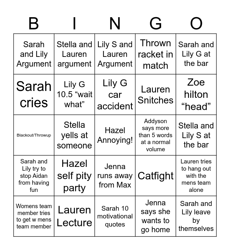 This bingo card has a free space and 24 words: Hazel self pity party, Lauren Lecture, Lily G car accident, Womens team member tries to get w mens team member, Sarah and Lily G at the bar, Sarah and Lily Argument, Sarah cries, Stella and Lauren argument, Addyson says more than 5 words at a normal volume, Jenna runs away from Max, Lauren Snitches, Blackout/Throwup, Catfight, Lauren tries to hang out with the mens team alone, Lily G 10.5 “wait what”, Jenna says she wants to go home, Stella and Lily S at the bar, Lily S and Lauren Argument, Zoe hilton “head”, Stella yells at someone, Sarah and Lily leave by themselves, Sarah and Lily try to stop Aidan from having fun, Thrown racket in match and Sarah 10 motivational quotes.