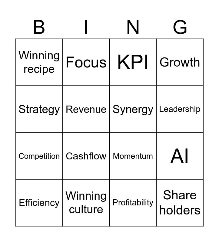 This bingo card has 21 words: Winning culture, Cash flow, Focus, Strategy, Profitability, Synergy, Winning recipe, KPI, Momentum, Leadership, Competition, Growth, Share holders, Efficiency, Revenue, AI, Efficiency, Cashflow, Strategy, AI and Momentum.