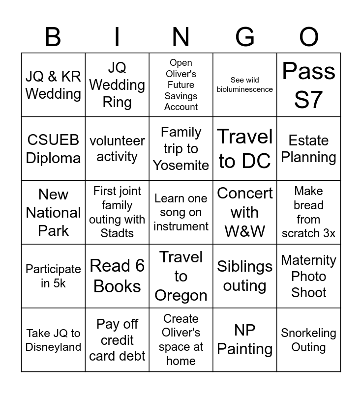 This bingo card has a free space and 24 words: Read 6 Books, Pay off credit card debt, Family trip to Yosemite, Take JQ to Disneyland, Pass S7, JQ & KR Wedding, CSUEB Diploma, JQ Wedding Ring, Concert with W&W, Travel to Oregon, Travel to DC, New National Park, Siblings outing, Maternity Photo Shoot, volunteer activity, NP Painting, Make bread from scratch 3x, Open Oliver's Future Savings Account, Estate Planning, First joint family outing with Stadts, Snorkeling Outing, Participate in 5k, See wild bioluminescence and Create Oliver's space at home.