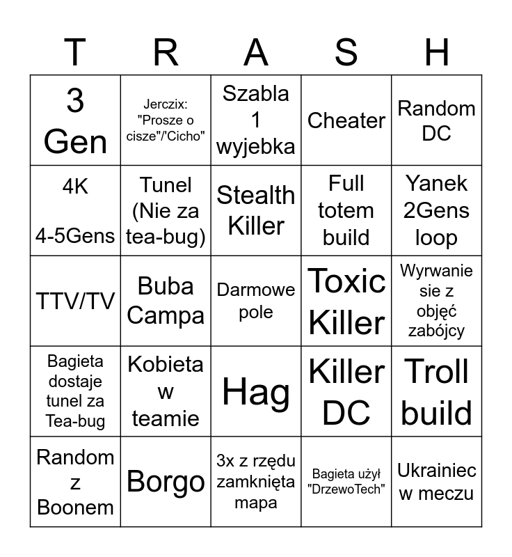This bingo card has a free space and 24 words: Random z Boonem, Kobieta w teamie, Stealth Killer, Bagieta użył "DrzewoTech", Random DC, 3 Gen, Jerczix: "Prosze o cisze"/'Cicho", Szabla 1 wyjebka, Toxic Killer, Wyrwanie sie z objęć zabójcy, TTV/TV, Tunel (Nie za tea-bug), Killer DC, Troll build, 4K 4-5Gens, Borgo, 3x z rzędu zamknięta mapa, Cheater, Yanek 2Gens loop, Bagieta dostaje tunel za Tea-bug, Buba Campa, Hag, Full totem build and Ukrainiec w meczu.