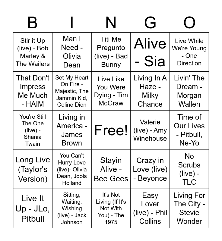 This bingo card has a free space and 39 words: Livin' la Vida Loca - Ricky Martin, Livin' On a Prayer - Bon Jovi, Live Your Life - T.I., Rihanna, Set My Heart On Fire - Majestic, The Jammin Kid, Celine Dion, Live It Up - JLo, Pitbull, Stayin Alive - Bee Gees, Live Like You Were Dying - Tim McGraw, How Do I Live - LeAnn Rimes, Live While We're Young - One Direction, Long Live (Taylor's Version), Living in America - James Brown, Alive - Sia, Living For The City - Stevie Wonder, Time of Our Lives - Pitbull, Ne-Yo, Valerie (live) - Amy Winehouse, You Can't Hurry Love (live)- Olivia Dean, Jools Holland, Silver Springs (live) - Fleetwood Mac, Stir it Up (live) - Bob Marley & The Wailers, Like a Prayer (live) - Miley Cyrus, Crazy in Love (live) - Beyonce, That Don't Impress Me Much - HAIM, It's Not Living (If It's Not With You) - The 1975, Living In A Haze - Milky Chance, Livin' The Dream - Morgan Wallen, Livin' It Up - Ja Rule, Livin It Up - Young THug, A$AP Rocky, Live, Laugh, Love - Clay Walker, I Lived - OneRepublic, Live Forever - Oasis, Man I Need - Olivia Dean, Good 4 U - Olivia Rodrigo, How Will I Know (live) - Whitney Houston, Titi Me Pregunto (live) - Bad Bunny, Sitting, Waiting, Wishing (live) - Jack Johnson, Easy Lover (live) - Phil Collins, MmmBop (live) - Hanson, No Scrubs (live) - TLC, You're Still The One (live) - Shania Twain and Man! I Feel Like A Woman (live) - Shania Twain.
