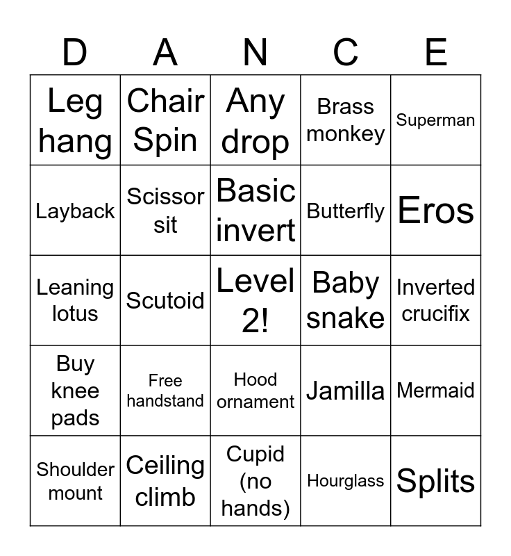 This bingo card has a free space and 24 words: Free handstand, Ceiling climb, Basic invert, Shoulder mount, Superman, Leg hang, Layback, Chair Spin, Baby snake, Hood ornament, Butterfly, Leaning lotus, Jamilla, Mermaid, Scissor sit, Hourglass, Inverted crucifix, Any drop, Eros, Scutoid, Splits, Buy knee pads, Brass monkey and Cupid (no hands).