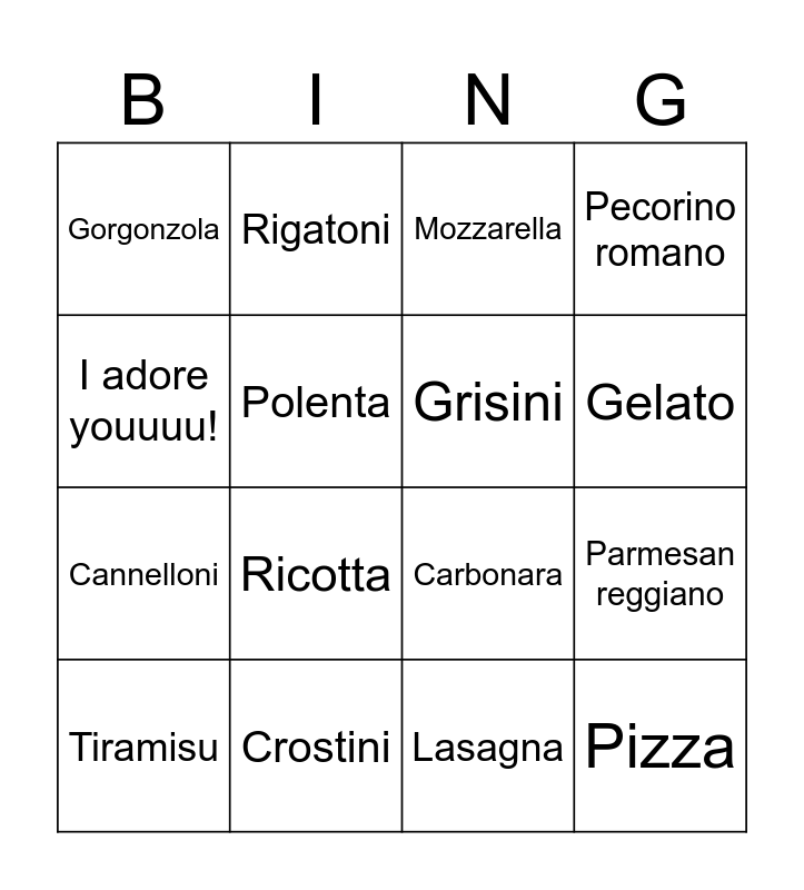This bingo card has 16 words: Crostini, Parmesan reggiano, Mozzarella, Gorgonzola, Cannelloni, Rigatoni, Carbonara, Lasagna, I adore youuuu!, Polenta, Tiramisu, Pecorino romano, Ricotta, Gelato, Grisini and Pizza.