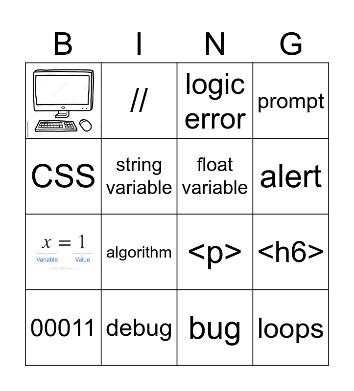 This bingo card has 3 images and 26 words: syntax, logical operators, <h6>, JavaScript, logic error, float variable, Free!, debug, array, bug, 00011, math operators, syntax error, algorithm, <h1>, loops, CSS, <p>, integer variable, HTML, string variable, prompt, //, ==, alert and ##.