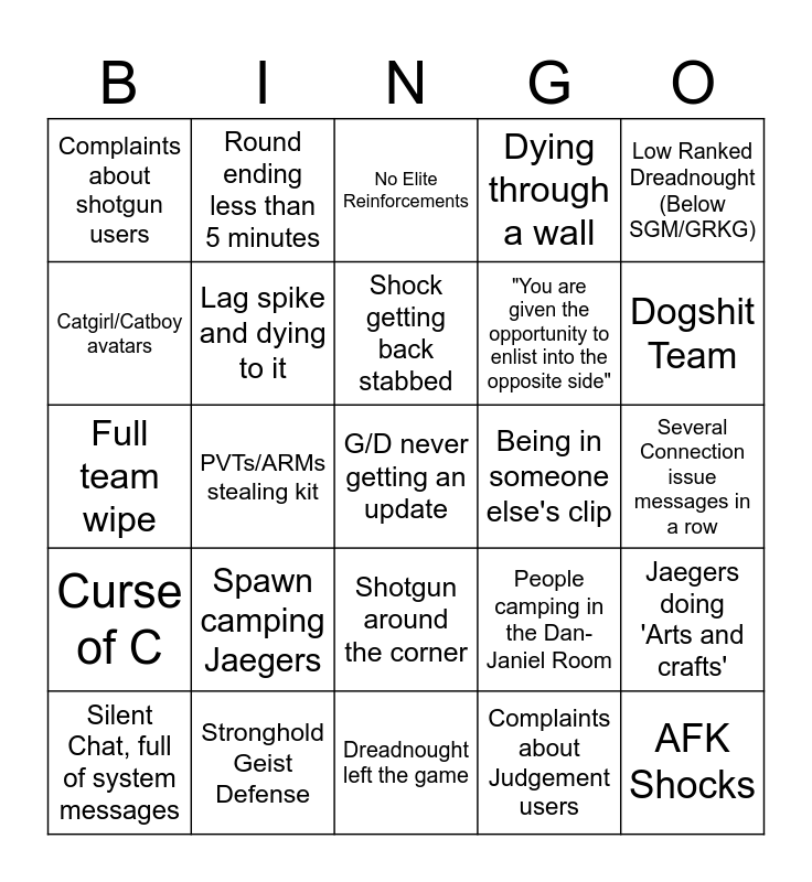 This bingo card has a free space and 24 words: Spawn camping Jaegers, Stronghold Geist Defense, Shock getting back stabbed, Silent Chat, full of system messages, Low Ranked Dreadnought (Below SGM/GRKG), Complaints about shotgun users, Catgirl/Catboy avatars, Round ending less than 5 minutes, Being in someone else's clip, Shotgun around the corner, "You are given the opportunity to enlist into the opposite side", Full team wipe, People camping in the Dan-Janiel Room, Jaegers doing 'Arts and crafts', Lag spike and dying to it, Complaints about Judgement users, Several Connection issue messages in a row, No Elite Reinforcements, Dogshit Team, PVTs/ARMs stealing kit, AFK Shocks, Curse of C, Dying through a wall and Dreadnought left the game.