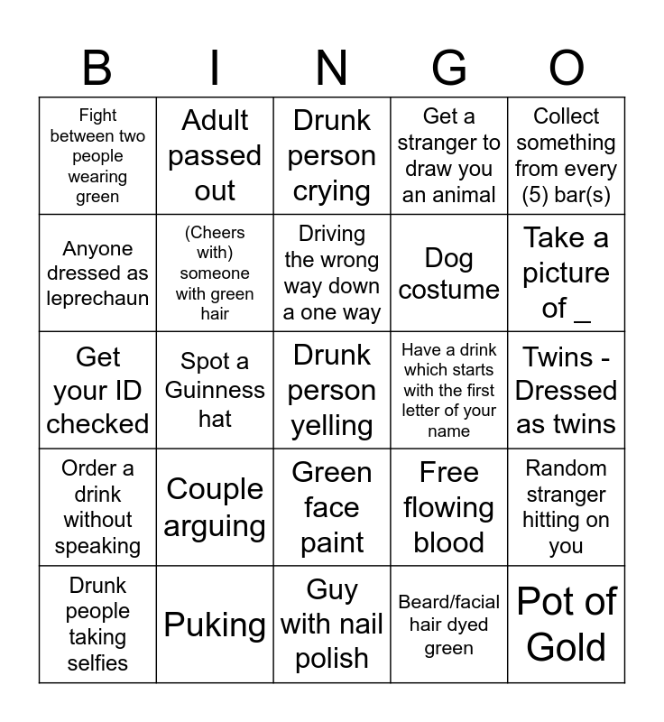 This bingo card has a free space and 24 words: Couple arguing, Puking, Driving the wrong way down a one way, Drunk people taking selfies, Collect something from every (5) bar(s), Fight between two people wearing green, Anyone dressed as leprechaun, Adult passed out, Have a drink which starts with the first letter of your name, Green face paint, Dog costume, Get your ID checked, Free flowing blood, Random stranger hitting on you, (Cheers with) someone with green hair, Beard/facial hair dyed green, Twins - Dressed as twins, Drunk person crying, Take a picture of _, Spot a Guinness hat, Pot of Gold, Order a drink without speaking, Get a stranger to draw you an animal and Guy with nail polish.