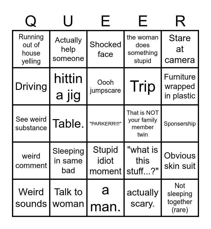 This bingo card has a free space and 24 words: Sleeping in same bad, Talk to woman, Oooh jumpscare, Weird sounds, Stare at camera, Running out of house yelling, Driving, Actually help someone, That is NOT your family member twin, Stupid idiot moment, Trip, See weird substance, "what is this stuff...?", Obvious skin suit, hittin a jig, actually scary., Sponsership, Shocked face, Furniture wrapped in plastic, Table., Not sleeping together (rare), weird comment, the woman does something stupid and a man..