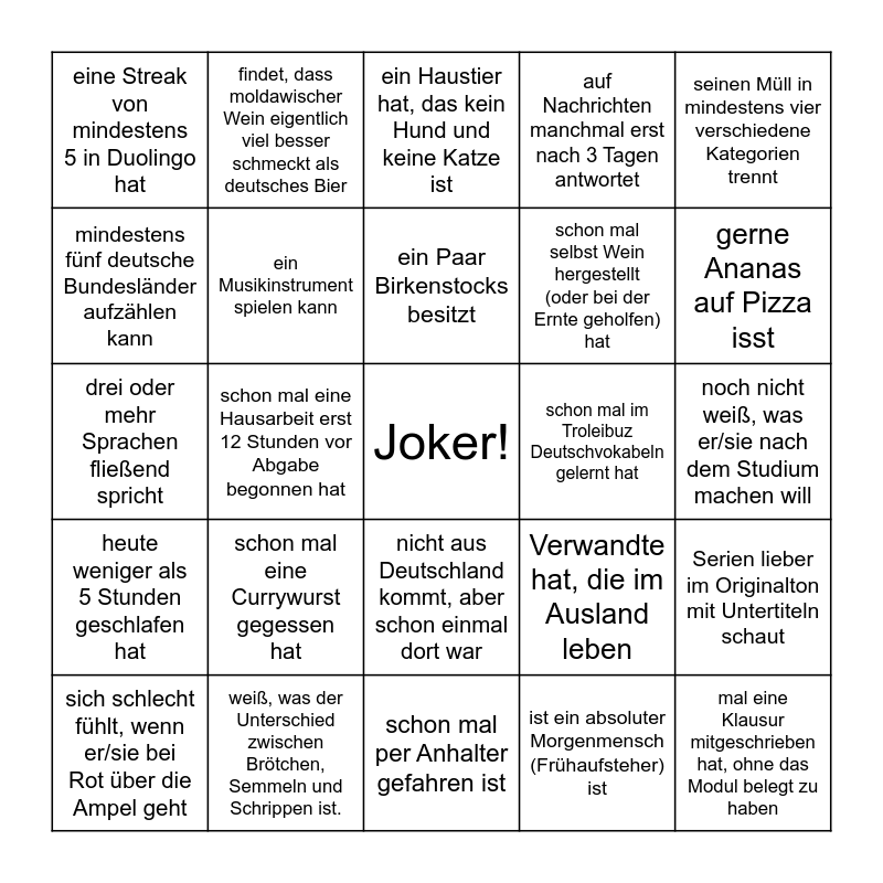 This bingo card has a free space and 24 words: schon mal eine Currywurst gegessen hat, weiß, was der Unterschied zwischen Brötchen, Semmeln und Schrippen ist., ein Paar Birkenstocks besitzt, sich schlecht fühlt, wenn er/sie bei Rot über die Ampel geht, seinen Müll in mindestens vier verschiedene Kategorien trennt, eine Streak von mindestens 5 in Duolingo hat, mindestens fünf deutsche Bundesländer aufzählen kann, findet, dass moldawischer Wein eigentlich viel besser schmeckt als deutsches Bier, schon mal im Troleibuz Deutschvokabeln gelernt hat, nicht aus Deutschland kommt, aber schon einmal dort war, schon mal selbst Wein hergestellt (oder bei der Ernte geholfen) hat, drei oder mehr Sprachen fließend spricht, Verwandte hat, die im Ausland leben, Serien lieber im Originalton mit Untertiteln schaut, ein Musikinstrument spielen kann, ist ein absoluter Morgenmensch (Frühaufsteher) ist, noch nicht weiß, was er/sie nach dem Studium machen will, ein Haustier hat, das kein Hund und keine Katze ist, gerne Ananas auf Pizza isst, schon mal eine Hausarbeit erst 12 Stunden vor Abgabe begonnen hat, mal eine Klausur mitgeschrieben hat, ohne das Modul belegt zu haben, heute weniger als 5 Stunden geschlafen hat, auf Nachrichten manchmal erst nach 3 Tagen antwortet and schon mal per Anhalter gefahren ist.
